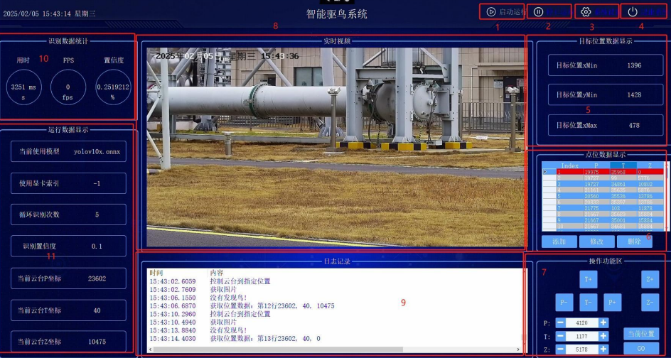 ? 實(shí)時(shí)監(jiān)控與回放:界面集成實(shí)時(shí)視頻流,并支持按路徑回放識(shí)別過程,每一只被驅(qū)趕的鳥都有視頻記錄。